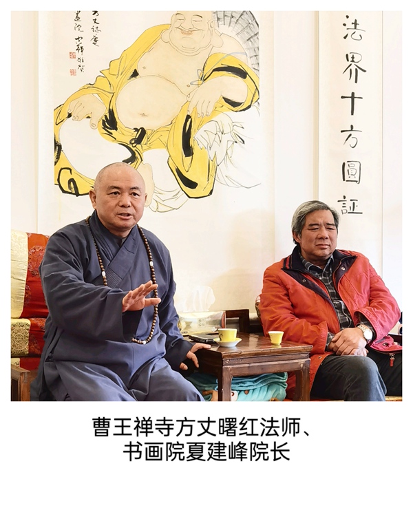 活动首站,众人拜见了正在习书的曹王禅寺方丈曙红法师。法师谦和地请大家先至客堂用茶,稍后即至。片刻之后,法师如约前来,与书画院同仁畅叙交流。曙红法师学识广博、谈吐从容,从佛法到艺术,由历史至人生,无不娓娓道来。令人感佩的是,法师不仅深谙书法、精研笔墨,更将整座寺院治理得井然有序,于一殿一阁、一草一木间,皆可见其修为与匠心。