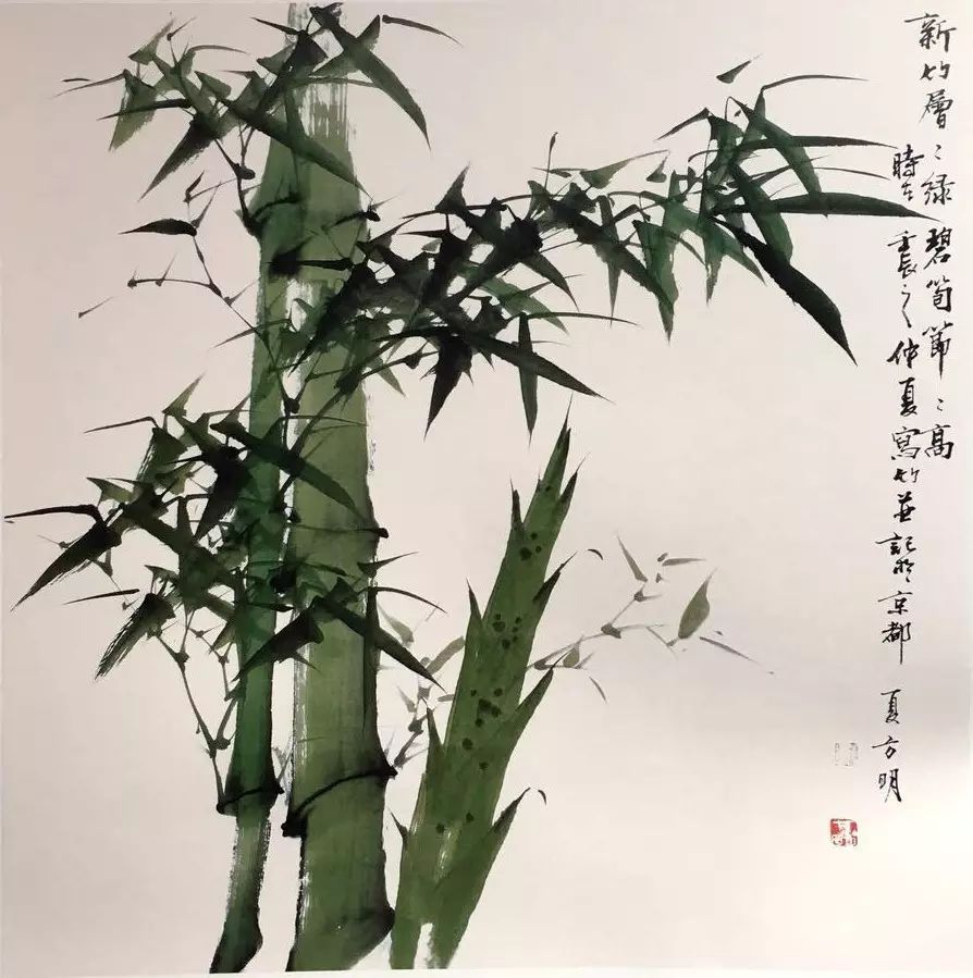 画竹先立竿,一竿之出基本决定了画面的布局,粗竿多用淡墨,用笔要挺拨,一竿直上干净利落,不可呆滞停顿。先出主竿控制好画面,再用稍微浓点的墨画出分枝,小枝能决定竹叶的位置,虽然很多小枝稍最后盖都被竹叶所覆盖,但是出小枝也不能马虎。竹叶的表现多以“个”“介”字为基础,运用这个程式不能过分刻板,既要有排列,也要有长短变化进行打破,这样一组叶子才能生动。