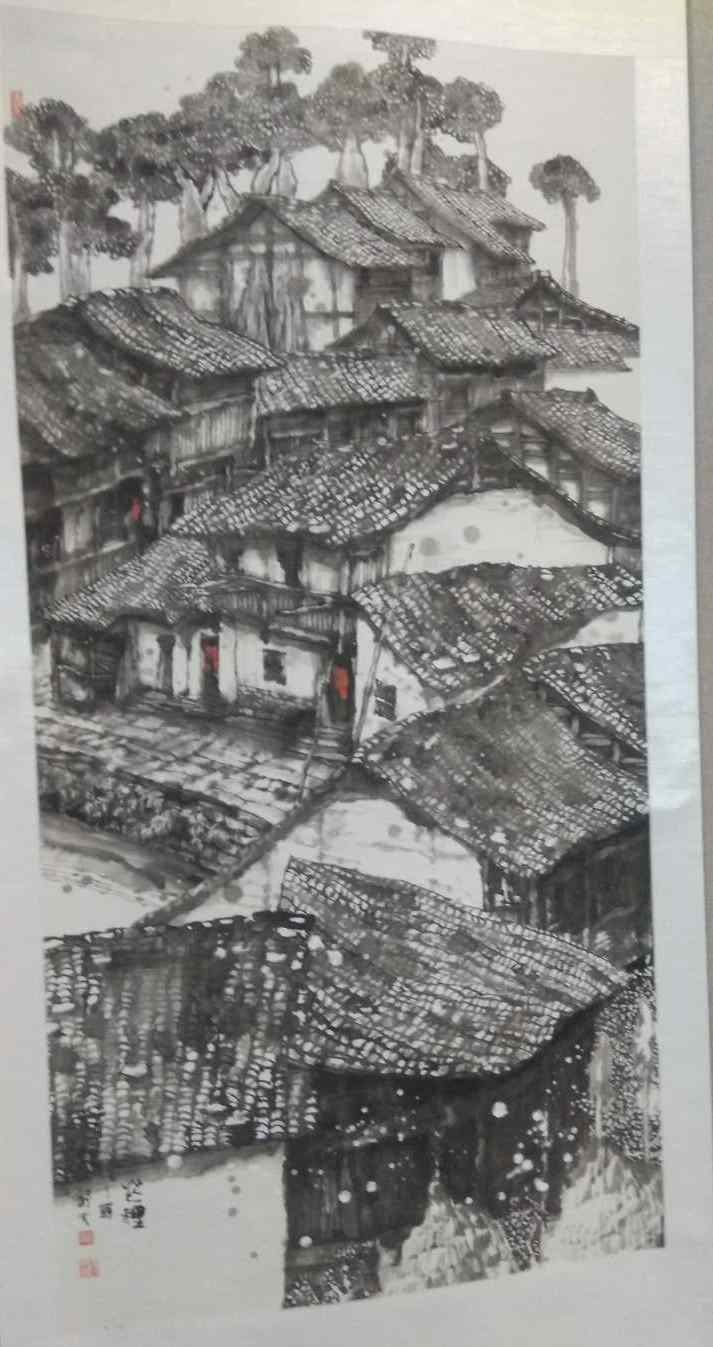 尽管昨天上午大雨倾盆,我和曹老师还是一起来到浦东张江的展览馆,一起来的还有曹老师的爱人,以及他可爱的外甥女,走进展馆,这里布置很别致,这里还是中国美术学院的一个创作基地,曹舒天和刘小晴的展览在二楼,可能由于下雨,展厅静悄悄的,参观人只有我们四位了,展厅布置的很好,书卷气很浓,一边是刘小晴的书法,一边是曹舒天的特色作品,我听曹老师一一介绍,有云南丽江古城,有湘西凤凰古镇,有中原的,有广西福建的,最多的是江南古镇,曹老师的爱人对曹老师的作品如数家珍的介绍。