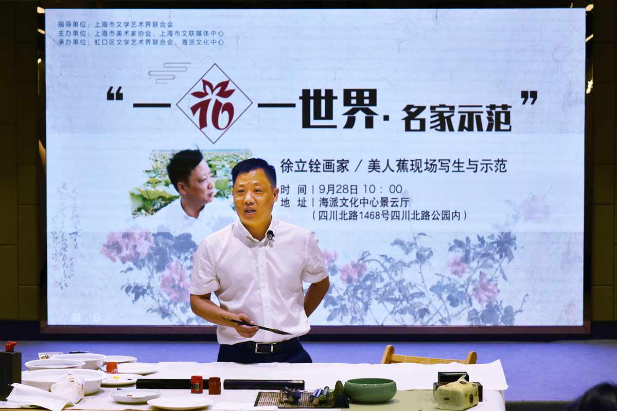 在上海市文学艺术界联合会指导,上海市文联媒体中心联合上海市美术家协会共同推出“一花一世界·名家示范”活动,第六期有著名画家徐立铨美人蕉写生示范活动与2018.9.28.上午九点在上海海派文化中心举行,这次活动有虹口区文联和上海海派文化中心承办,上午八点半已经有许多艺术爱好者早早地来到海派文化中心广场写生现场,电视直播的工作人员也早早地来到现场调试摄像机。