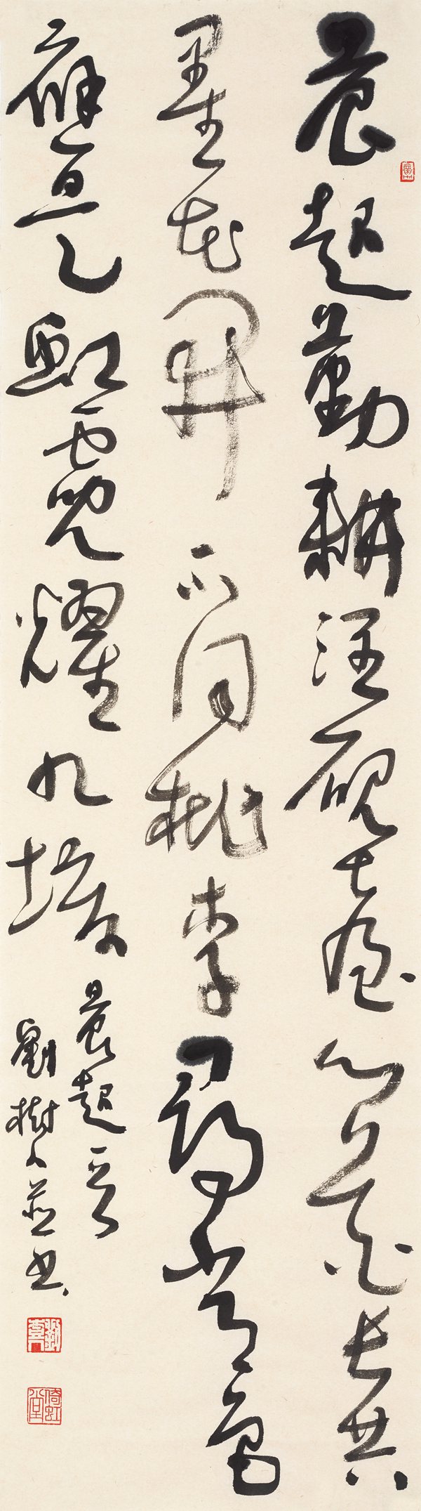 “妙在似与不似之间”是艺术的高级境界,这也启迪我们把追求“似与不似之间”作为一种创作思路。实现“在似与不似之间”,就可以得到“妙”,即达到理想的艺术效果。上海一位画家在其创作随感中提出“走极端”,我觉得很有意思。走极端,往“似”的方向走,就是把某家某帖写得逼真乱真,但“太似为媚俗”,为高境界的艺术创作所不取;往“不似”的方向走,就是把某个想法、体验写到极致,向规定性的边缘、度的尽头不断探索,追求形成个性鲜明的艺术风格,但在“不似”面前要止步,不能越雷池。因为“不似为欺世”,比如那些借书法为名搞出的行为艺术、江湖杂耍之类。把握“似与不似之间”当然不是容易的事,而须具备一定的书法修养。首先要明确“似”的标准、范本,然后要明确“不似”的边界、界限,这样才能在二者之间探索发掘、创新前行。比如,在笔法上,范本是方笔?圆笔?能否化方为圆或化圆为方?在字法上,如何根据唐楷重心偏上的“黄金分割率”,进行夸张变形?在章法上,如何变常见的平实安排,强化疏密对比,形成“疏可走马,密不透风”?在墨法上,如何运用涨墨、枯笔,丰富作品的表现力?等等,诸如此类,不一而足。最重要的是,对这些问题的探索要形成系统,达到成熟,能够“从心所欲不逾矩”——这条书法成功之路十分漫长,也许力不能至,但应心向往之。