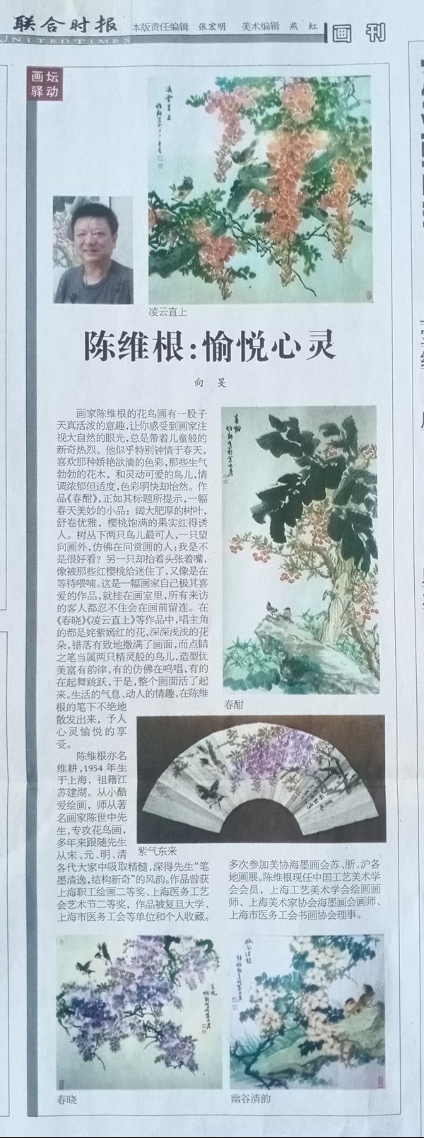 祖籍江苏盐城,1953年生于上海,自幼酷爱绘画,师承画家陈世中先生,专攻花鸟画,在绘画领域中克苦专研从宗、元、明、清各代大家中吸取精髓,作品深得“笔墨清逸,结构新奇”的风韵。