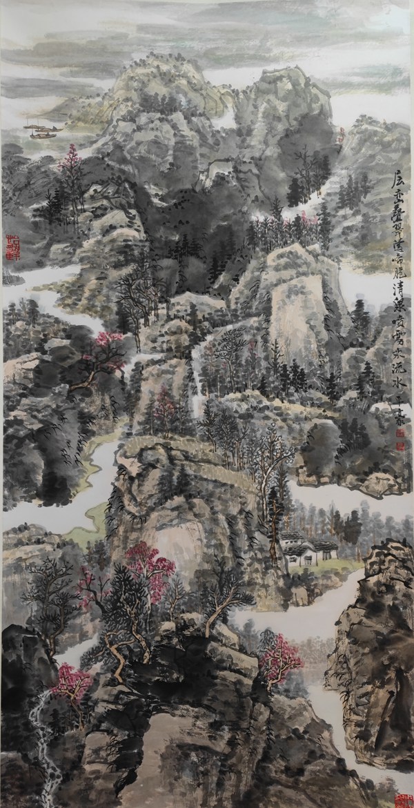 这几年,上海中国画坛进入中年的国画家大多很沉稳,山水画在他们看来更重笔墨的涵养。从这幅画中我们可以看出平豪将王蒙与龚贤的山水画融合,这本是用笔姿在做春山的大文章,又以小青绿衬托其神,这样一幅春景就显出春光无限的魅力。真如艺术大理论家所讲的,现当代的山水就是散文的笔调描活富春山居图,上溯古风,下拥生活气息,平豪领会其神。所以,这几年,平豪的山水画创作有着显著的进步,我想这也是平豪将深情的笔墨升华到修养的原因。